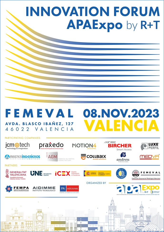 El INNOVATION FORUM APAExpo by R+T, 8 noviembre 2023 en la sede de FEMEVAL Valencia, contará con un espacio B2B donde los profesionales asistentes podrán realizar encuentros bilaterales con las empresas participantes en el INNOVATION FORUM APAExpo by R+T 2023. En el salón de actos de FEMEVAL se desarrollará un programa de ponencias y presentaciones sobre la coyuntura y expectativas del sector de las puertas automáticas.