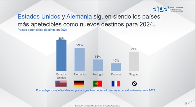 En cuanto a la internacionalización, el proceso de desglobalización también comienza a vislumbrarse: la mitad de las empresas exportadoras apuntan como barrera a la internacionalización la regulación y aspectos fiscales en los países destino. En este sentido, el continente americano se consolida como destino de las exportaciones de puertas automáticas españolas, con especial pujanza e interés sobre el mercado de Estados Unidos.