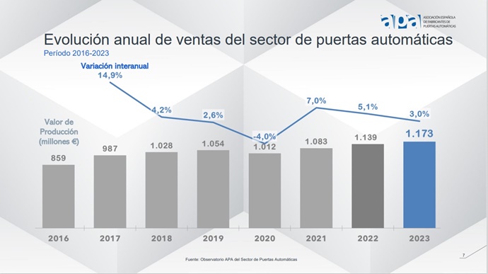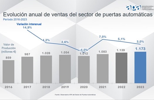 El sector de fabricación de puertas automáticas aumentó un 3% sus ventas durante 2023. Este crecimiento es superior al aumento del PIB del global de la economía española, que se situó en el 2,5% para el mismo período.
