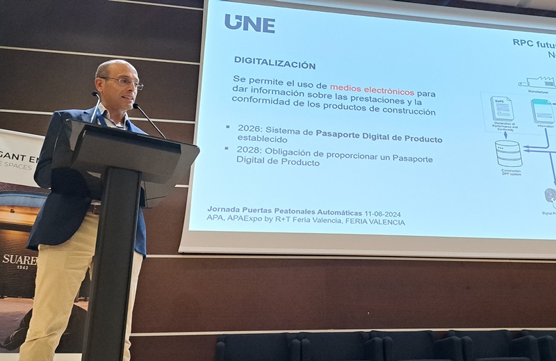 El pasado día 11 de junio, la JORNADA DE PUERTAS AUTOMÁTICAS organizada por APA, Asociación Española de Fabricantes de Puertas, en Feria Valencia, tuvo como ponente central a D. Javier López-Quiles Pastor, Gestor de Proyectos de Normalización de Construcción de UNE, bajo el título: