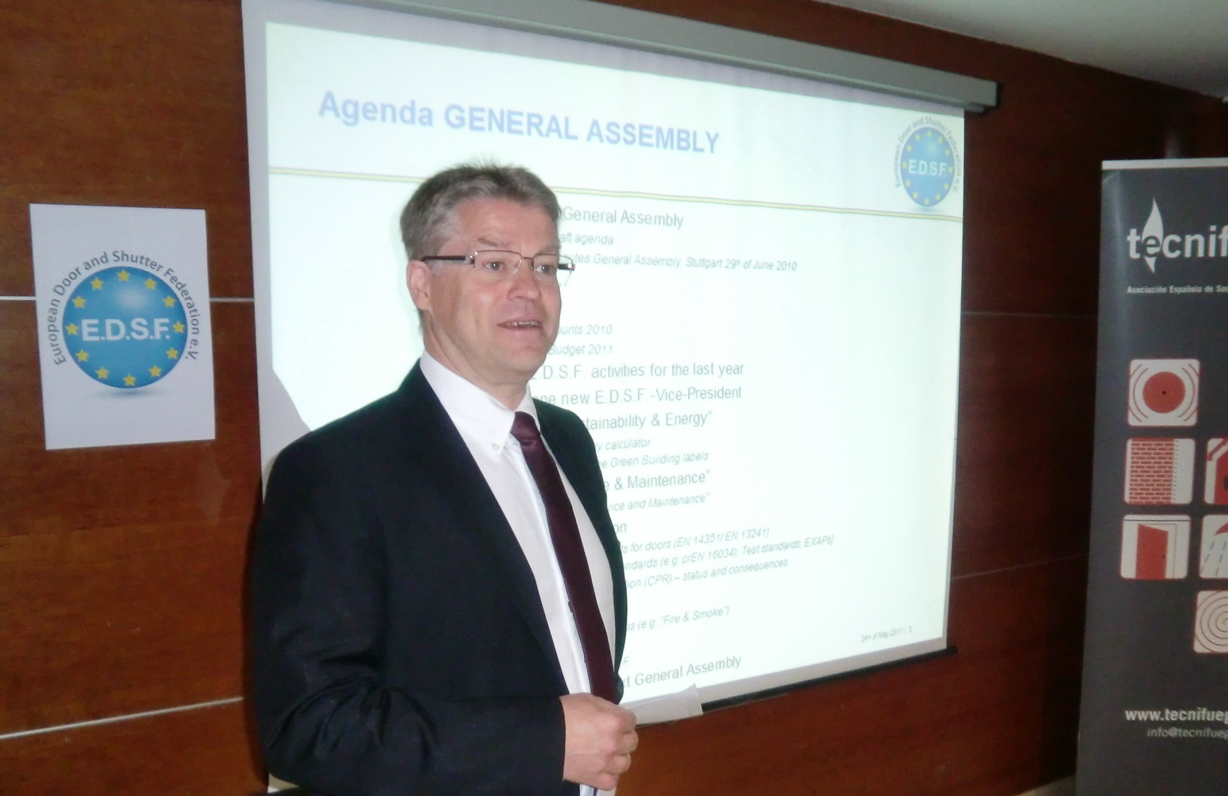 J.P. - Las Asambleas Generales son itinerantes, recorriendo todos los países europeos. En España es la primera vez que ubicamos este convocatoria anual, y el escoger la ciudad de Madrid, ha sido, además de su ubicación, por la participación de Tecnifuego-Aespi y AEPA, la Asociación Española de Empresas de Puertas Manuales y Automáticas. Otro de los motivos es por la urgencia que se percibe desde el resto de Europa de una concienciación, de las empresas y profesionales españoles del sector de las puertas automáticas y puertas de garaje, sobre el asociacionismo y la colaboración, especialmente en esta coyuntura de crisis.
