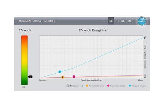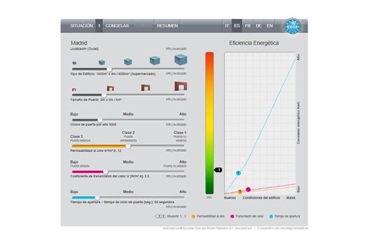 El Calculador de Energía online de E.D.S.F. identifica las pérdidas de energía provocadas por el efecto de la apertura y cierre de las puertas, calculado durante un tiempo determinado. El impacto real de la puerta en las pérdidas de energía de los edificios son presentadas en el Calculador de Energía a través del “coeficiente U”, permeabilidad al aire e infiltración, según el tipo de puerta, sus medidas y el tamaño del espacio.