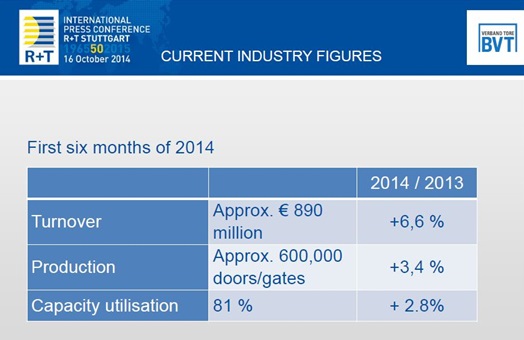 Una vez superada la crisis económica y financiera, el sector alemán de puertas y portones había experimentado una mejora considerable y durante los dos años anteriores se mostró estabilizado a un alto nivel. Durante la primera mitad de este año el volumen total de negocio del sector con un aumento del 6,6% ha sido de 890 millones de euros. Este desarrollo se debe sobre todo a un considerable crecimiento del volumen de ventas en el primer trimestre, pero comparado con los datos del mismo trimestre del año anterior donde las condiciones climáticas no fueron óptimas.