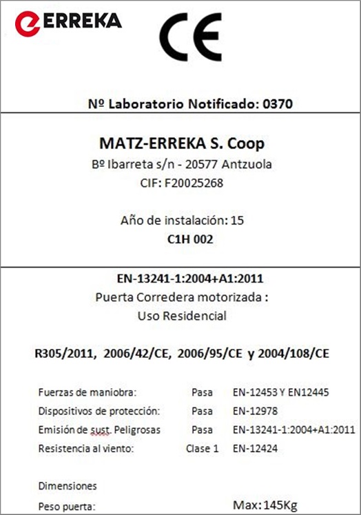 Las puertas de aluminio ERREKA cumplen con el Reglamento Europeo de los Productos de la Construcción Nº 305/2011 y están abaladas con las certificaciones de producto por un laboratorio notificado.