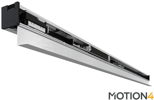 Para llegar a unas medidas tan reducidas, MOTION4 lleva desarrollando desde el año 2008 su propia tecnología magnética de motor lineal, consistente en realizar el movimiento de la hoja mediante un motor que se desplaza a lo largo del chasis por atracción y repulsión de imanes, permitiendo desplazar una o dos hojas móviles de hasta 80 Kg. y 1400 mm de carrera cada una.