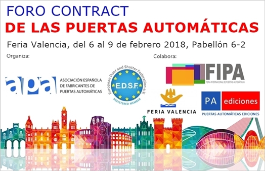 El FORO CONTRACT DE LAS PUERTAS AUTOMÁTICAS, organizado por APA, Asociación Española de Fabricantes de Puertas Automáticas, con la colaboración de FIPA/Feria Valencia y PA ediciones, se desarrollará del 6 al 9 de febrero del 2018 en Feria Valencia, Pabellón 6-2. Coincidiendo con los certámenes CEVISAMA y FIMMA-MADERALIA.
