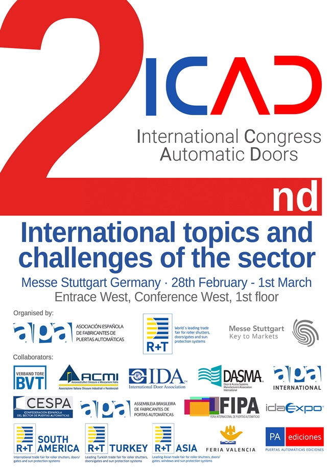 El 2º ICAD, CONGRESO INTERNACIONAL DE PUERTAS AUTOMÁTICAS tendrá lugar el 28 de febrero y el 1 de marzo de 2018, en el contexto de R + T 2018 en Stuttgart / Alemania. organizado conjuntamente por APA (Asociación Española de Fabricantes de Puertas Automáticas), R+T y Messe Stuttgart. Una vez más, el evento recibe el apoyo de asociaciones nacionales e internacionales de puertas automáticas. Sumándose en esta 2nd edición del ICAD la Confederación Española del Sector de las Puertas Automáticas (CESPA).
