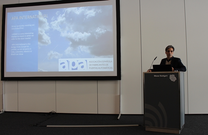 Lucas Olmos, coordinador del GT Internacionalización de APA, y Joao Batista, presidente de APA Brasil, introdujeron una visión de los sectores de puertas automáticas de Latino América. Lucas Olmos puntualizó que “APA España, se visualiza como puente entre Europa y LATAM, su papel es crear el puente entre Europa y LATAM a través de APA Internacional, con APA Brasil, APA Chile, APA Colombia, APA México…”.