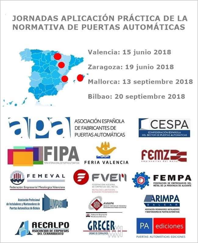 Los días 15 y 19 de junio, y el 13 y 20 de septiembre, tendrán lugar en Valencia, Zaragoza, Mallorca y Bilbao, respectivamente, las jornadas de puertas abiertas sobre la “aplicación práctica de la normativa en la instalación y mantenimiento de las puertas automáticas de garaje, industriales, portones y peatonales”.