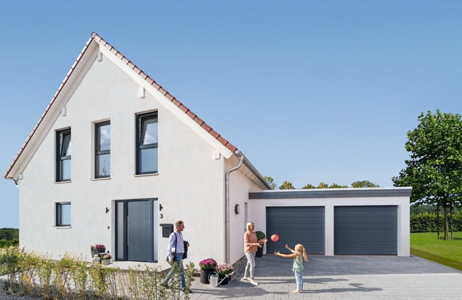 Por otro lado, la puerta de entrada Thermo46 de acero/aluminio convence tanto por su diseño como por su aislamiento térmico y seguridad. Gracias a su elegante hoja enrasada de 46mm de grosor sobre toda la superficie, tanto en el lado interior como en el exterior con perfil de hoja interior, cumple las más elevadas exigencias de diseño. Cabe destacar también que la puerta Thermo46 dispone de un elevado nivel de aislamiento térmico con un valor UD de hasta 1,2W/(m2K) aproximadamente. Además, dispone de un cerco de aluminio de 60 mm de grosor con rotura de puente térmico de aspecto Roundstyle.