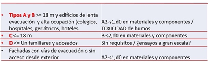 En relación a los cambios introducidos y referidos a la protección frente al fuego de fachadas, desde el Comité de Fabricantes de Protección Pasiva de TECNIFUEGO queremos puntualizar que la actualización se ha quedado muy lejos de nuestro posicionamiento, que es más exigente y queda resumido en el cuadro de abajo. En los cambios propuestos pese a que pueda existir una cierta sensación de mejora, esta sólo se daría en los edificios de gran altura ya que para el resto muchos materiales con una mala reacción al fuego podrían formar parte de los sistemas.
