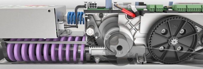 El muelle de mayor tamaño resulta potente y compacto, garantizando el cierre mecánico de la puerta con un movimiento armónico y seguro. Otro muelle de menor tamaño actúa únicamente en la fase final de cierre, ejerciendo un mayor empuje en este tramo, venciendo posibles resistencias como el viento.