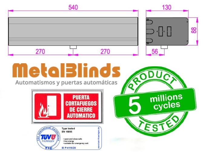 Permite la automatización de puertas cortafuego, según normas BS EN 15725 y EN 1634-1.