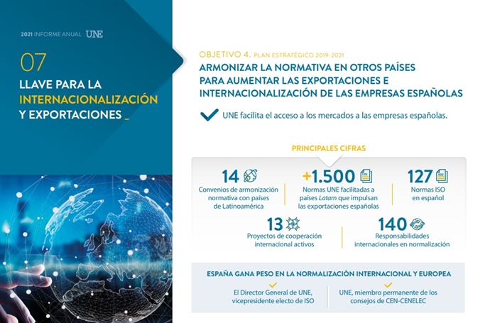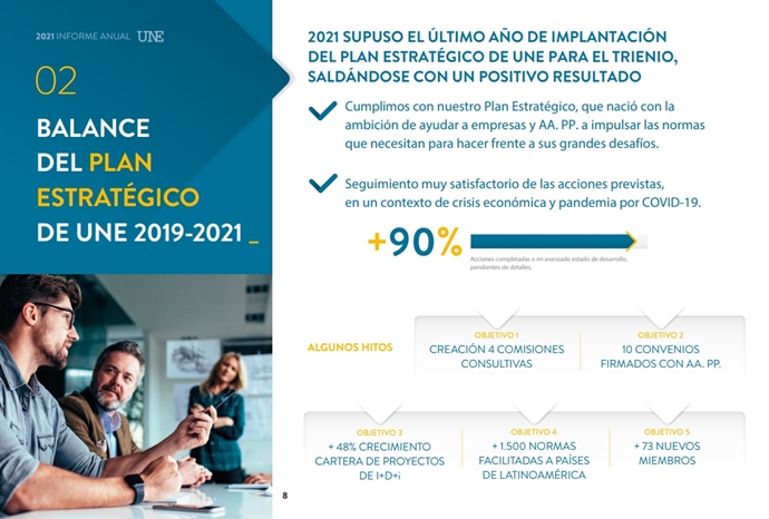 •UNE cumple su Plan Estratégico 2019-2021 con un resultado muy positivo. Entre los hitos están el peso ganado por España en la normalización internacional con el nombramiento de Javier García, director general de UNE, como vicepresidente de ISO; la incorporación de 73 nuevos miembros y la firma de diez convenios con las Administraciones públicas.
