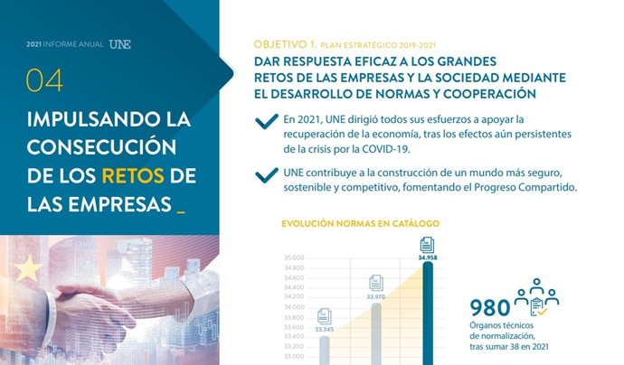 Entre las actuaciones llevadas a cabo en 2021 para fortalecer el tejido empresarial español, UNE presentó junto con CEOE el informe Normas UNE para la recuperación económica, cuyo objetivo es impulsar a las empresas y orientarlas en la implementación de los proyectos desarrollados a través de los fondos europeos Next Generation EU. Las normas son aliadas estratégicas de las empresas en los proyectos del Plan de Recuperación, Transformación y Resiliencia, además de servir de guía a las Administraciones en el reparto de los fondos europeos.