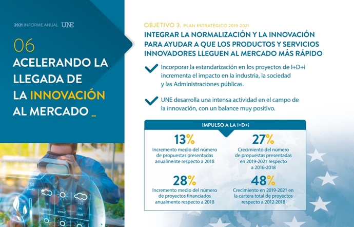 Además, la cartera de proyectos de I+D+i del organismo se ha incrementado un 48%, logrando que los productos y servicios más innovadores puedan incorporarse al mercado con más rapidez, eficacia y éxito. UNE es el socio de normalización de estos proyectos de I+D+i.