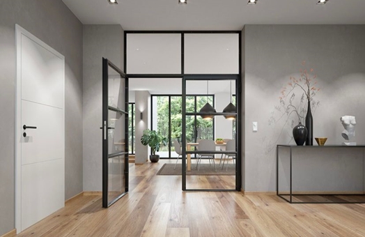 Por otra parte, las puertas Loft se distinguen por la combinación de cristal y acero. Dicha conexión garantiza un diseño moderno y elegante. En cuanto al acristalamiento de las puertas, se compone de vidrio laminado de seguridad de 6 mm, lo que se puede diseñar como acristalamiento transparente de serie y, si se desea, con una lámina mate. Además de garantizar la incidencia natural de la luz y la máxima transparencia, el cristal y acero permite abrir y separar espacios con las puertas Loft.