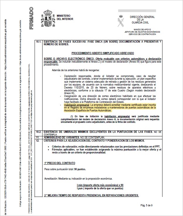 El Ministerio del Interior, reconociendo la rigurosidad y valor del Registro de Empresas Instaladoras y Mantenedoras de la Asociación Española de Fabricantes de Puertas Automáticas, APA, en los requisitos y documentaciones a presentar en sus procesos de licitación solicita que la empresa acredite mediante certificado estar inscrita en el Registro de Empresas Instaladoras y Mantenedoras de Puertas Automáticas de la Asociación Española de Fabricantes de Puertas Automáticas.