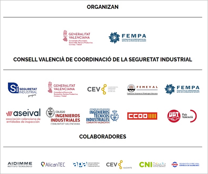 Por último, destacar que es una iniciativa promovida por el Consell Valencià de Coordinació de la Seguretat Industrial en la que participa la Conselleria de Economía Sostenible, Sectores Productivos, Comercio y Trabajo, la Federación Empresarial Metalúrgica Valenciana (FEMEVAL), la Federación de Empresarios del Metal de la Provincia de Alicante (FEMPA), la Asociación Valenciana de Entidades de Inspección (ASEIVAL), el Colegio Oficial de Ingenieros Industriales de la Comunitat Valenciana (COIICV), el Consejo de Colegios Oficiales de Ingenieros Técnicos Industriales de la Comunitat Valenciana (COGITICOVA) y los agentes sociales representados por CEV, CCOO y UGT.