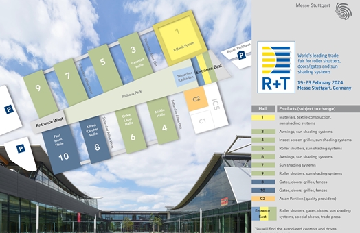 «La división temática de los pabellones de la pasada edición de R+T tuvo en general buena aceptación y estuvo muy bien valorada por nuestras y nuestros visitantes. Por este motivo nos gustaría conservar este concepto para R+T 2024 y darle continuidad», explica Melanie Brenner. El concepto de pabellones para R+T 2024 tendrá el siguiente aspecto: el sector de la protección solar ocupará como suele ser habitual el L-Bank Forum (Pabellón 1), el Ceratizit Halle (Pabellón 3), el MAHLE Halle (Pabellón 4), el Pabellón 5, el Oskar-Lapp-Halle (Pabellón 6) y los pabellones 7 y 9.